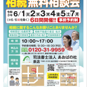 2021.05.26【2021年6月開催】相続無料相談会開催のお知らせ相続無料相談会 司法書士法人あおばの杜では、下記のとおり、相続無料相談会を開催します。 相続対策、認知症対策、おひとりさま対策など相続に関するご・・・ -